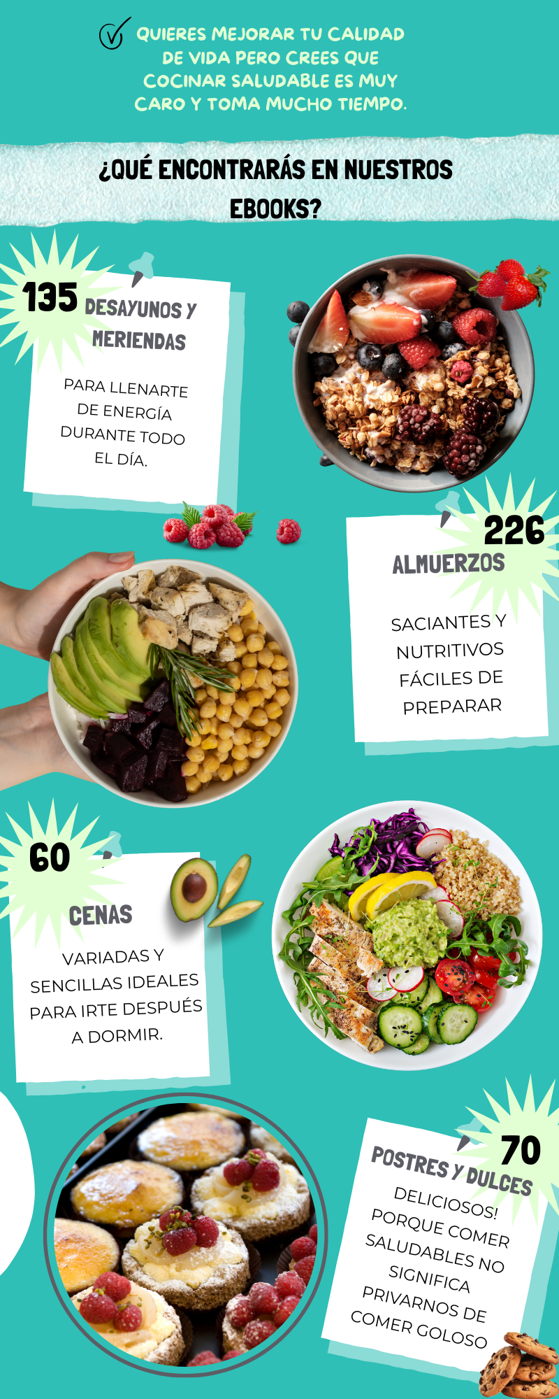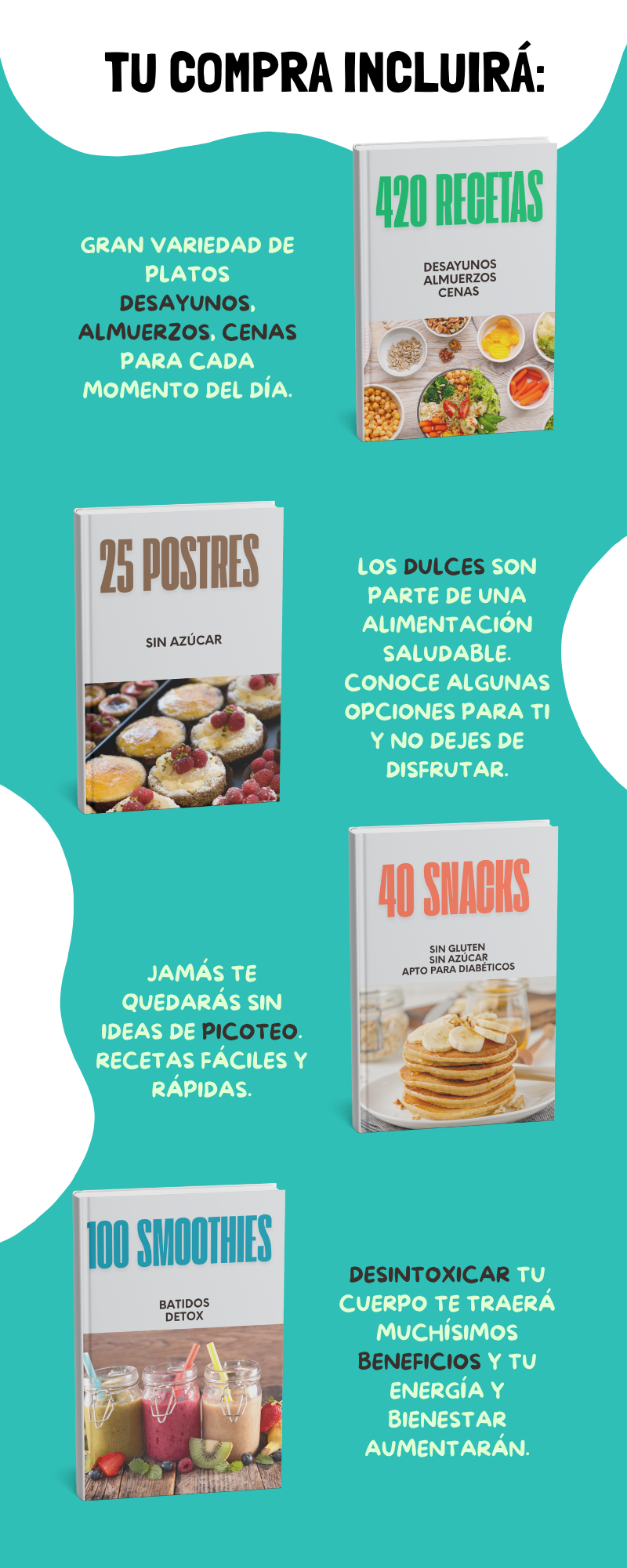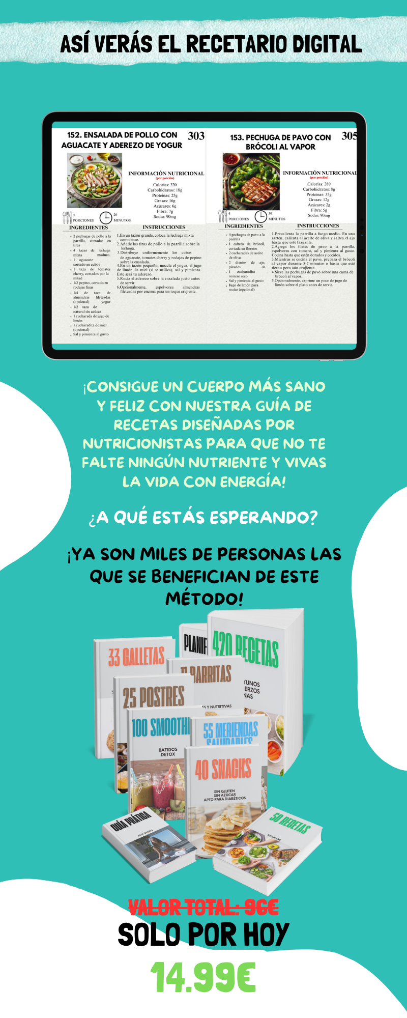 Porque estos libros te ahorran tiempo ya que tienes cientos de recetas saludables para mejorar tu alimentación todas juntas! Gracias a los conocimientos de los profesionales que lo crearon, tendrás el camino directo a unos riquisimos platos, sanos y nutritivos para ti y tu familia.